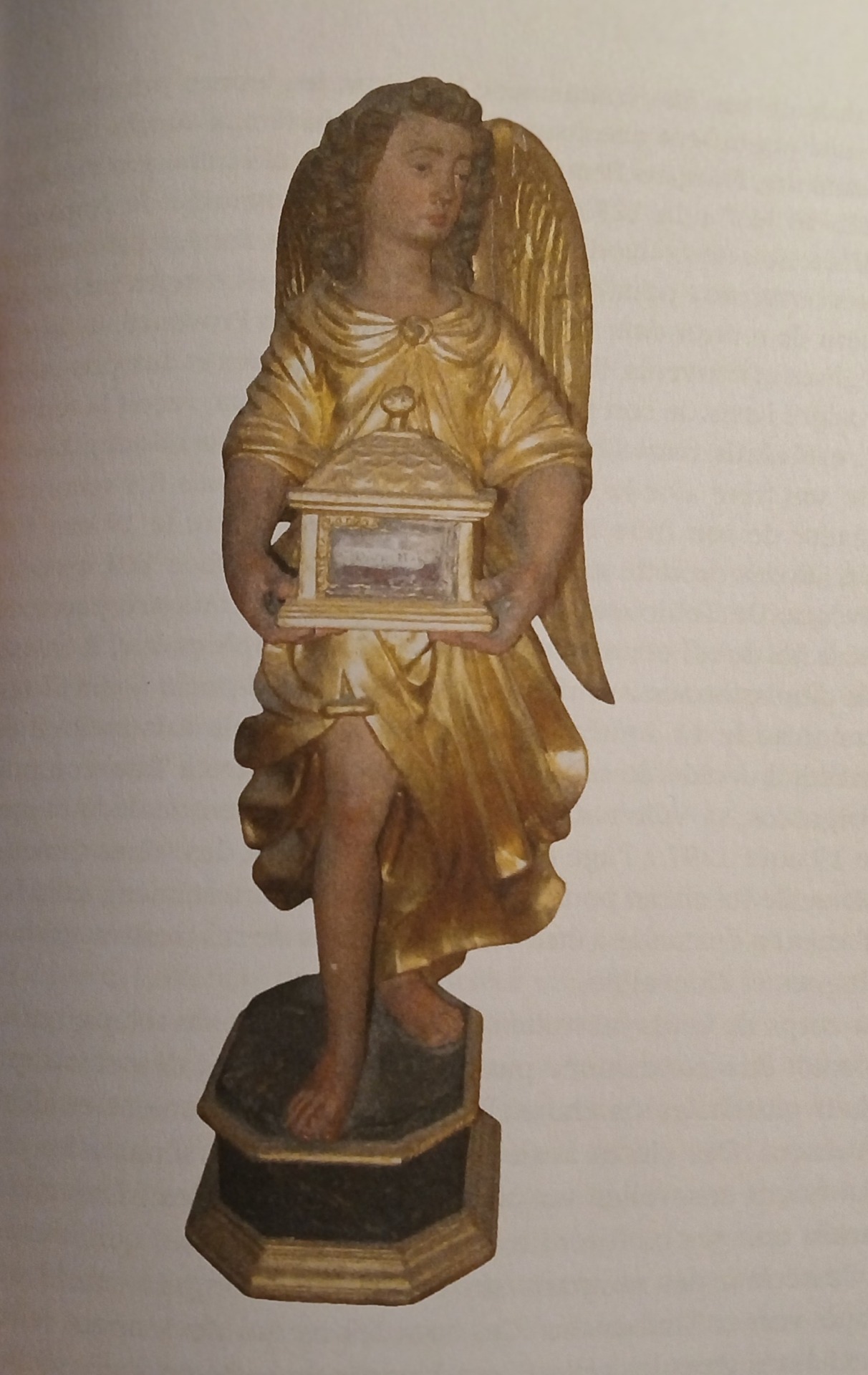 Statue-reliquaire de Sainte Douceline identifiée comme étant sainte Digne sur le phylactère, ange portant la châsse, église collégiale Notre Dame la Grande, Poitiers. Inscrite à l'inventaire des Monuments Historiques depuis 2016.
